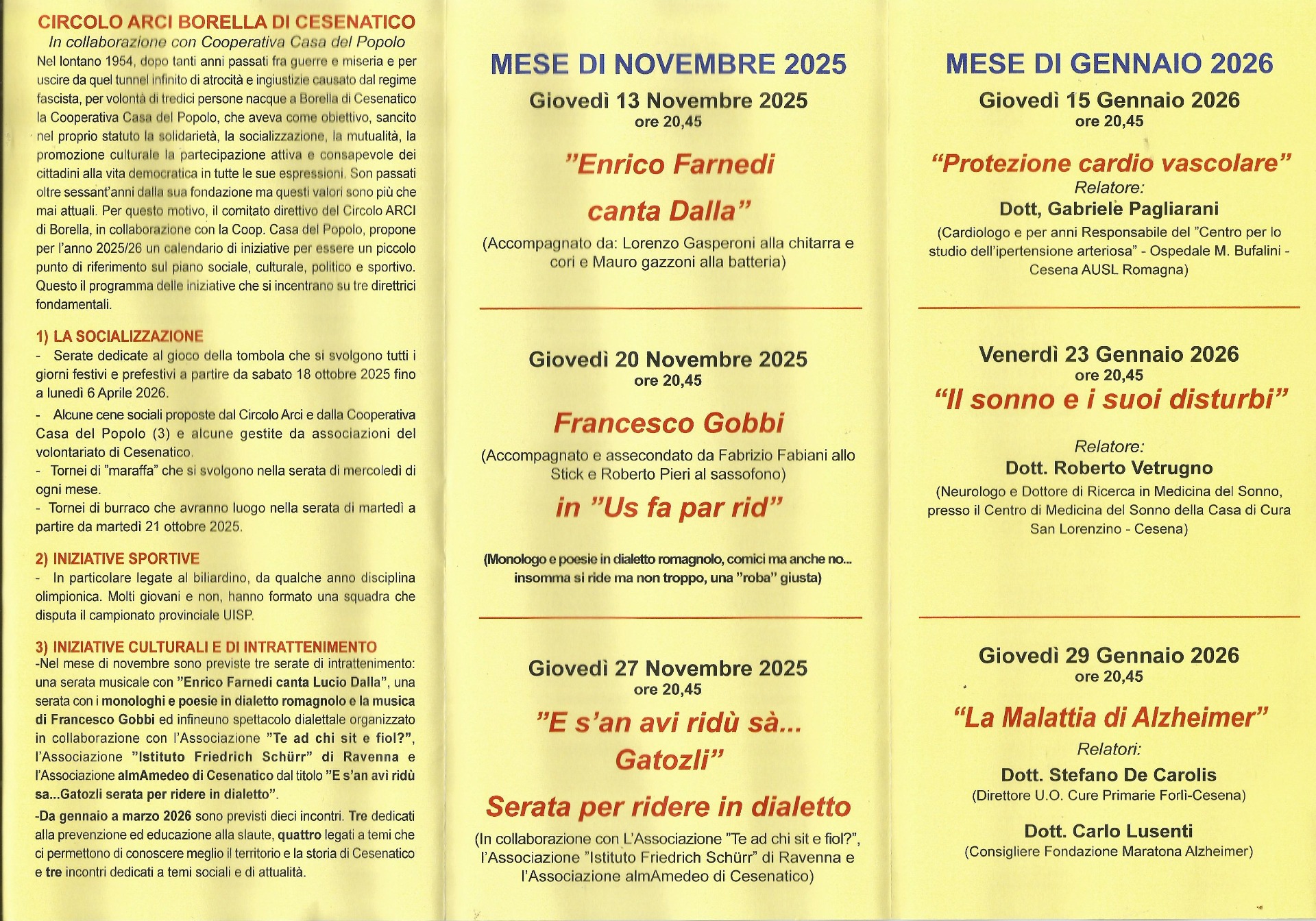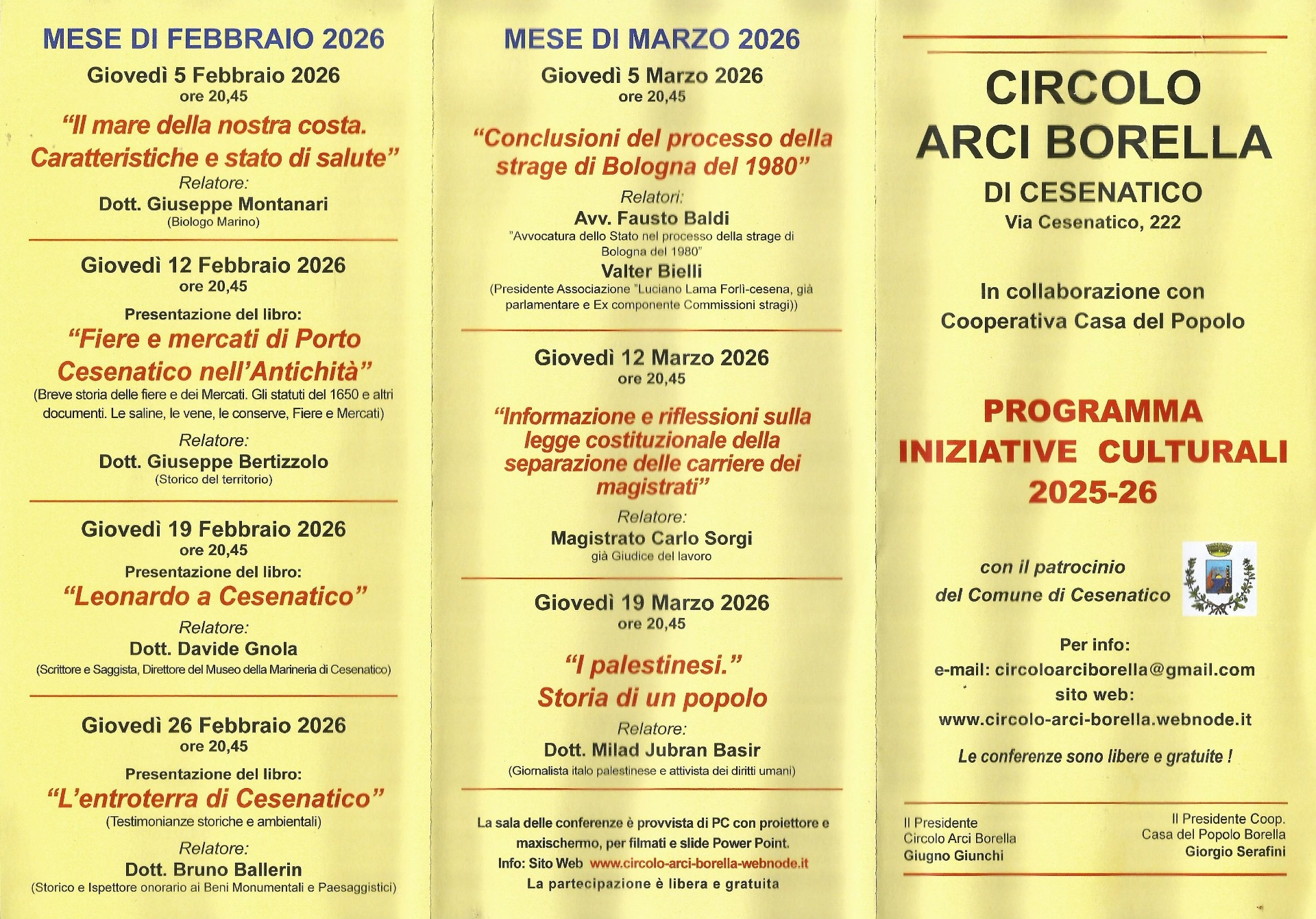 Nel lontano 1954, dopo tanti anni passati fra guerre e miseria e per uscire da quel tunnel infinito di atrocità e ingiustizie causato dal regime fascista, per volontà di tredici persone nacque a Borella di Cesenatico la Cooperativa Casa del Popolo, che aveva come obiettivo, sancito nel proprio statuto la solidarietà, la socializzazione, la mutualità, la promozione culturale la partecipazione attiva e consapevole dei cittadini alla vita democratica in tutte le sue espressioni. Son passati oltre settant'anni dalla sua fondazione ma questi valori sono più che mai attuali. Per questo motivo, il comitato direttivo del Circolo ARCI di Borella, in collaborazione con la Coop. Casa del Popolo, propone per l'anno 2025/2026 un calendario di iniziative per essere un piccolo punto di riferimento sul piano sociale, culturale, politico e sportivo.